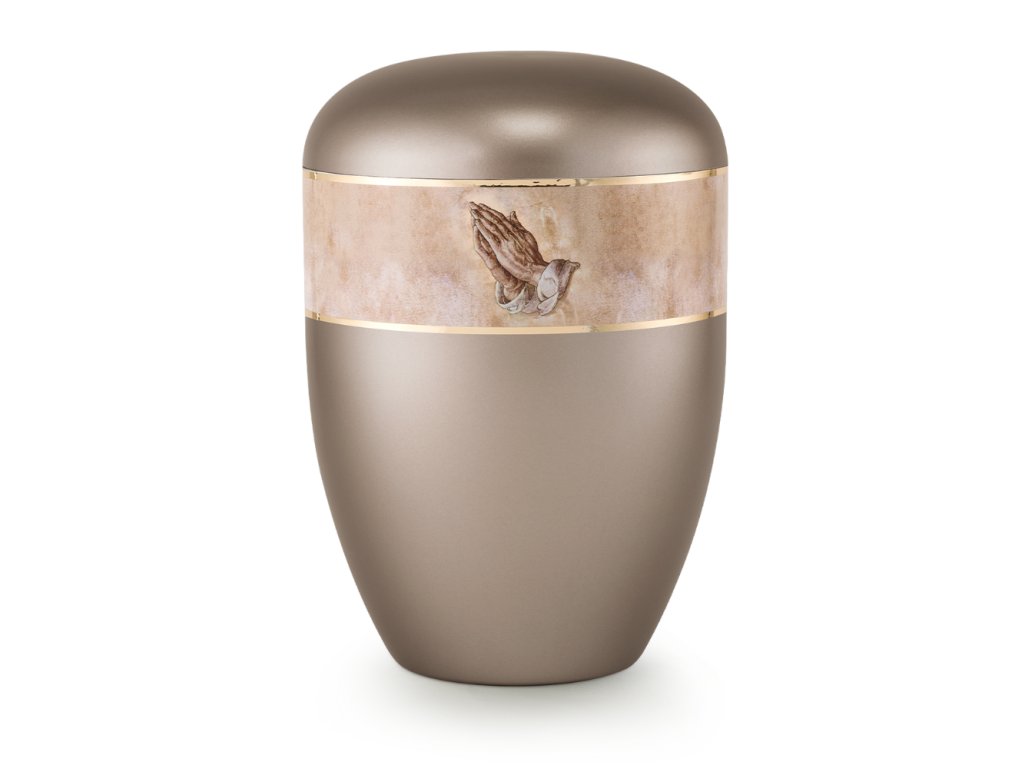 Ekologická urna 360° má povrch v hnedej farbe a je zdobená okrasným pásikom s motívom modlitby. Ozdobný opasok je lemovaný jemnými zlatými prúžkami. Táto kombinácia dodáva urne veľmi elegantný vzhľad.