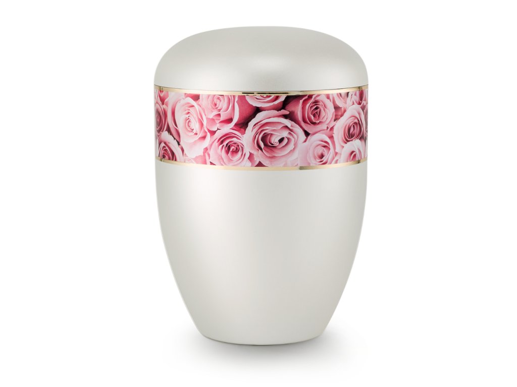 Ekologická urna 360° má povrch v bielej farbe a je zdobená okrasným pásikom s motívom ruže. Ozdobný opasok je lemovaný jemnými zlatými prúžkami. Táto kombinácia dodáva urne veľmi elegantný vzhľad.