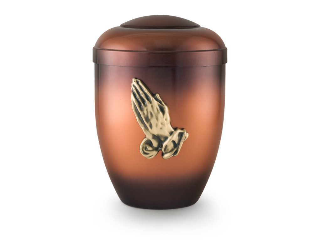 Ekologická urna Aku má žíhaný povrch ktorý postupne prechádza z tmavšej do svetlej a je zdobená motívom modlitby. Táto kombinácia medeného vzhľadu a zlatého motívu je veľmi krásna.