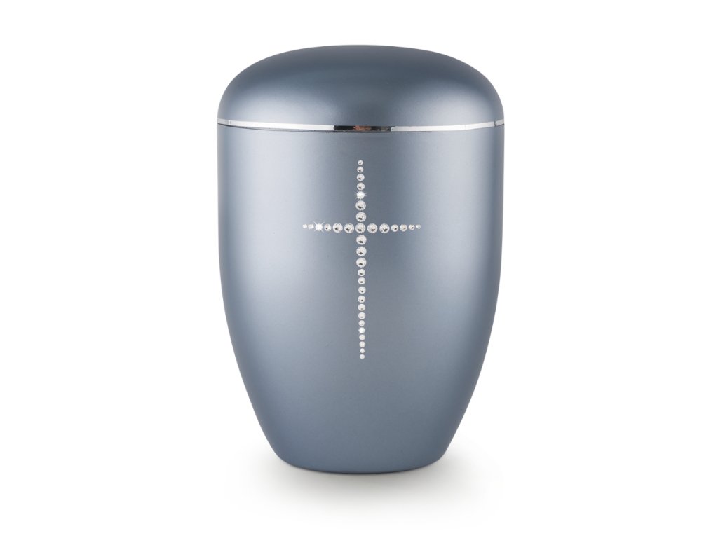 Ekologická urna Crystal Kríž má povrch v šedej farbe a je zdobená ručne skladanými kvalitnými kamienkami Swarovski do motívu kríža. Veko je zdobené lesklým strieborným pruhom. Táto kombinácia pôsobí veľmi elegantne.