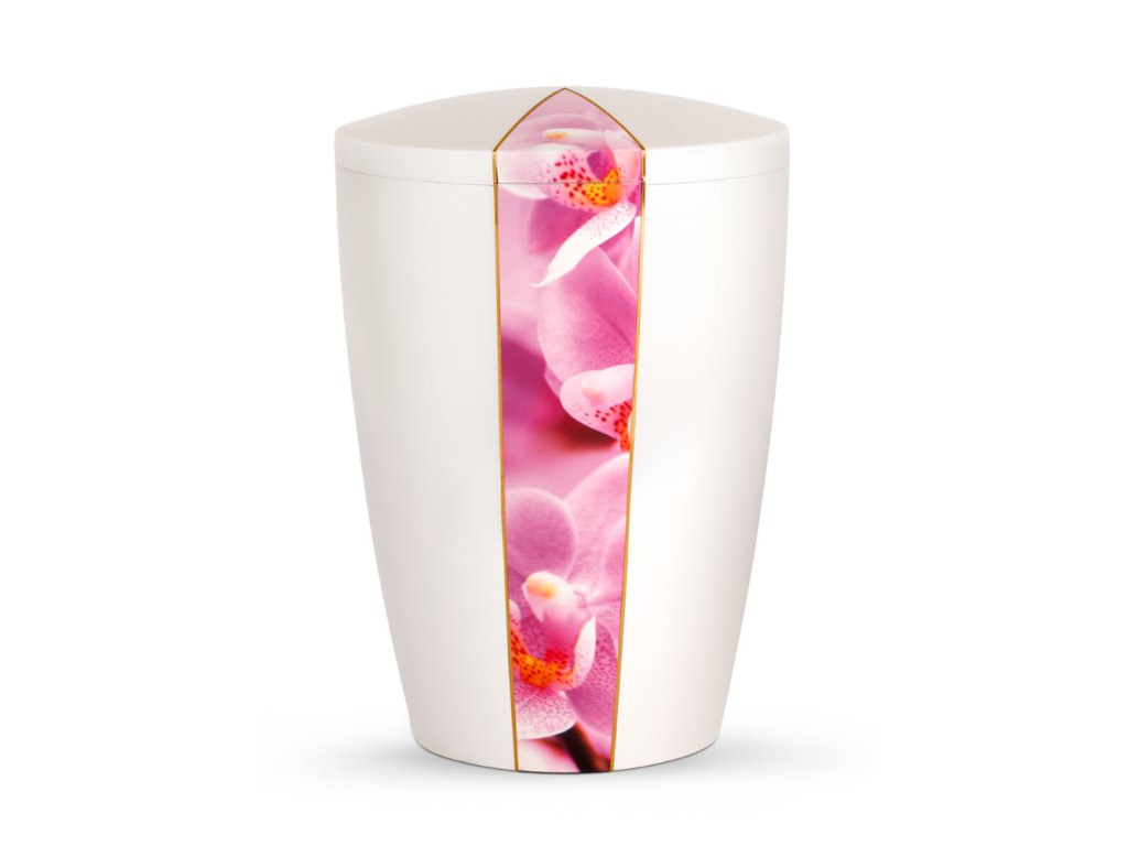 Ekologická urna Flora White má matný povrch v odtieni perleťovej bielej a je zdobená vertikálnym ozdobným pruhom s motívom orchidey. Motív je orámovaný jemnými zlatými prúžkami.
