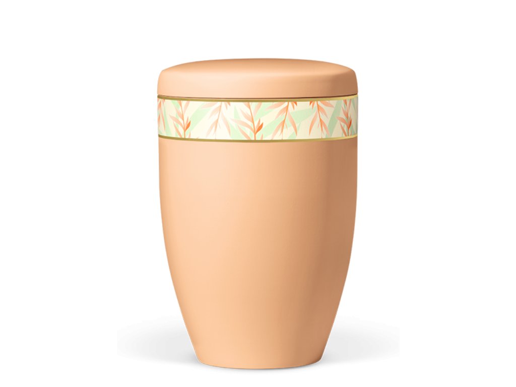 Ekologická urna Floral má matný povrch v oranžovej farbe a je zdobená opaskom s motívom kvetov. Ozdobný opasok je lemovaný lesklými striebornými prúžkami.