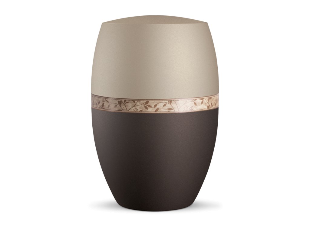 Ekologická urna Infinity Papyrus má povrch v odtieni champagne a sienna a je zdobená opaskom s motívom listov. Opasok je lemovaný jemnými matnými prúžkami.