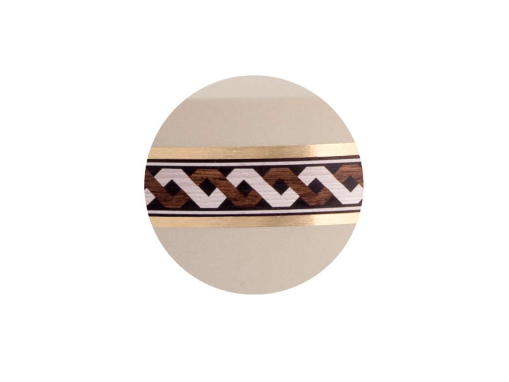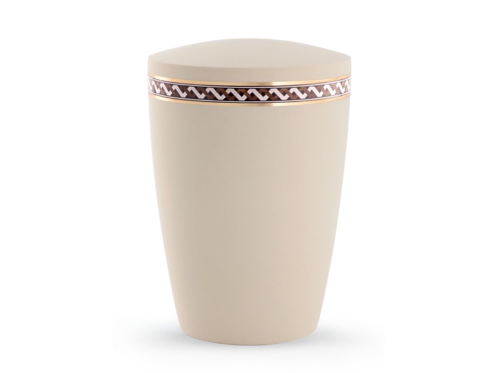 Ekologická urna Intarsia II má povrch v krémovej farbe a je zdobená opaskom s motívom vĺn. Ozdobný opasok je lemovaný jemnými zlatými prúžkami.