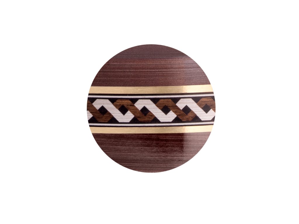 Ekologická urna Intarsia IV má povrch v hnedej farbe a je zdobená opaskom s motívom vĺn. Ozdobný opasok je lemovaný jemnými zlatými prúžkami. Veko je v krémovej farbe.