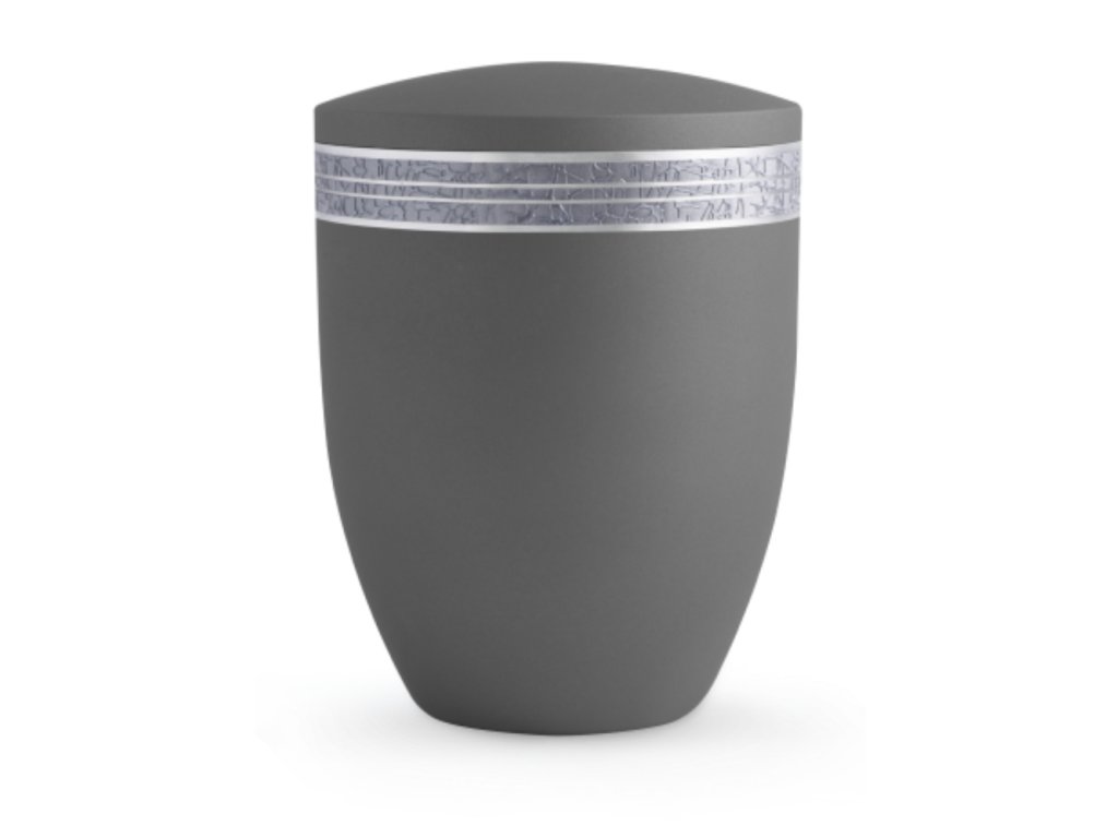 Ekologická urna Krypta má matný povrch v odtieni antracitovej šedej a je zdobená mozaikovým pásikom v striebornej farbe. Ozdobný opasok je doplnený strieborným lemovaním. Táto kombinácia je veľmi elegantná.