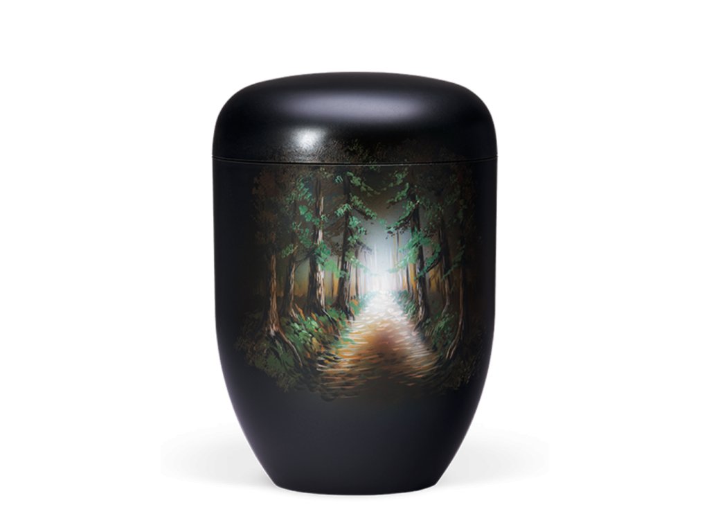 Ekologická urna Maľba má matný povrch v čiernej farbe a je zdobená motívom lesnej cesty. Motív je ručne malový a je vyobrazený vo farebnom prevedení. Kombinácia matnej farby a ručne maľovaného motívu vytvára veľmi elegantný vzhľad.