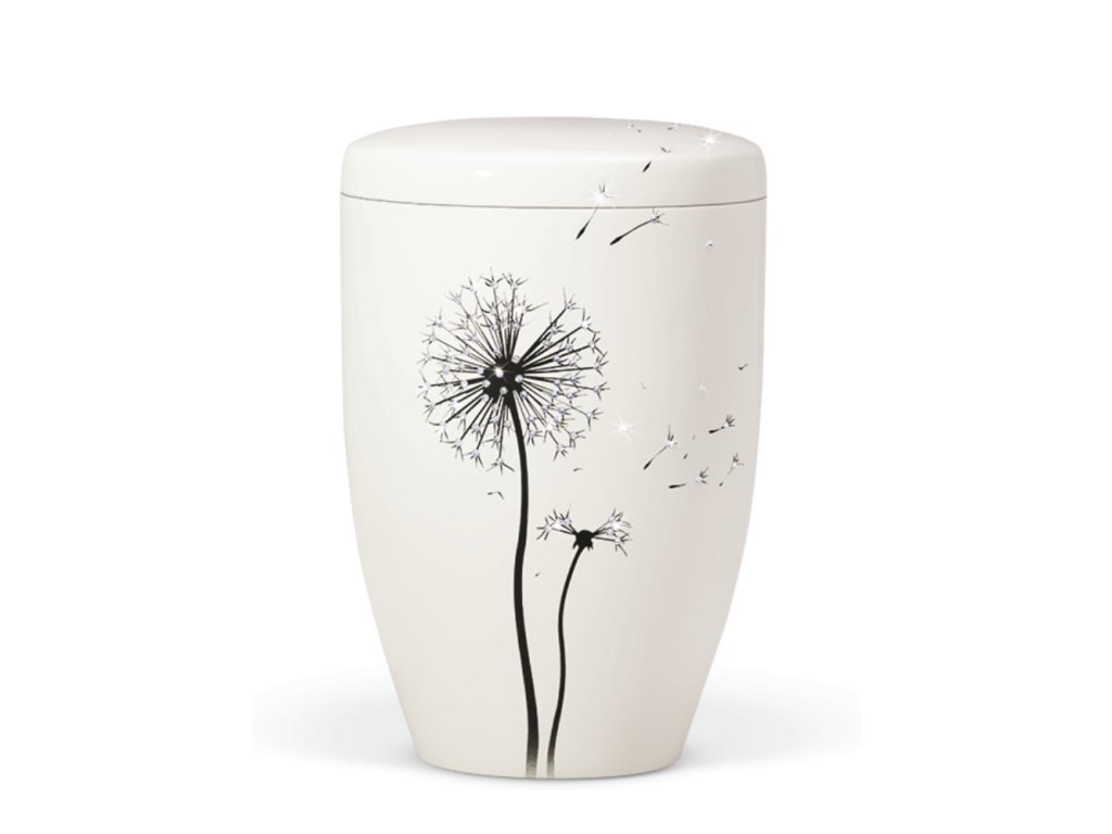 Ekologická urna Pure II má povrch v bielej farbe a je zdobená motívom púpavy, ktorá je zdobená ručne nanášanými kamienkami Swarovski. Vďaka kamienkom Swarovski vynikajú detaily motívu púpavy.