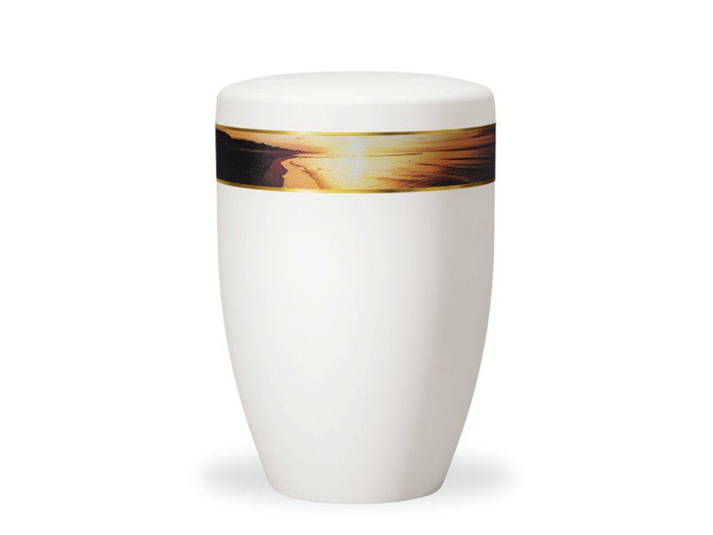 Ekologická urna Royal White má matný povrch v bielej farbe a je zdobená opaskom s motívom západu slnka okolo obvodu urny. Ozdobný opasok je lemovaný lesklými zlatými prúžkami.
