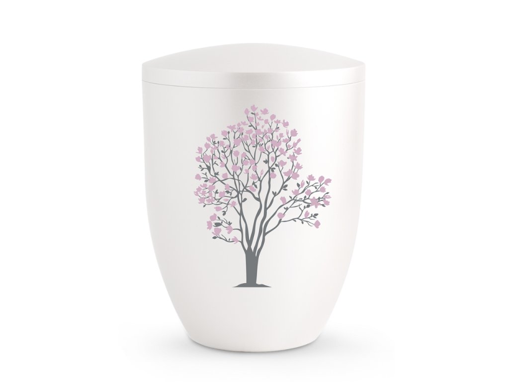 Ekologická urna Silva II má povrch v odtieni perleťovo bielej a je zdobená farebným motívom čerešne. Strom symbolizuje večný život a poukazuje na novú životnú silu, rast a požehnanie.
