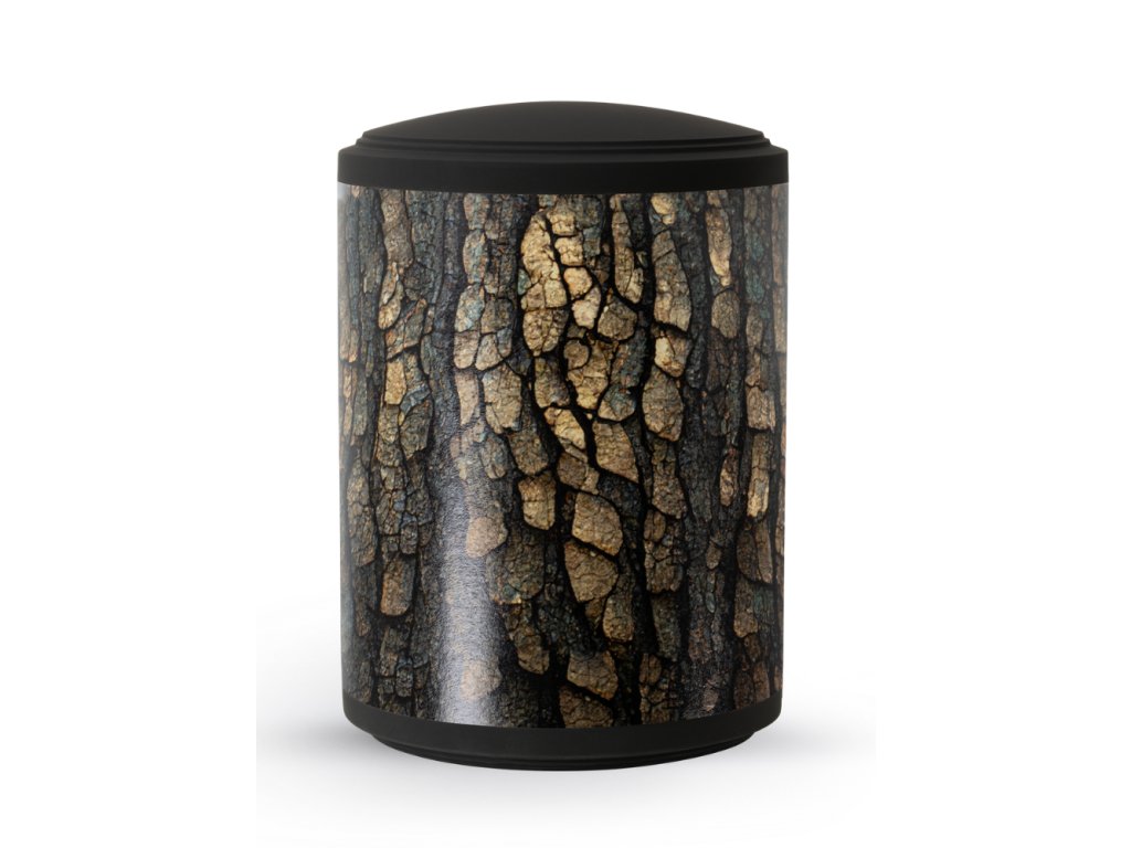 Ekologická urna Ventura má matný čierny povrch, ktorý je zdobený okolo obvodu fólií s motívom kôry jelše. Táto urna svojim motívom zachytáva krásu prírody.