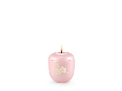 je vyrobená z vysoko kvalitnej keramiky. Miniurna v ružovéj farbe je potiahnutá matným povrchom soft-touch, vďaka ktorému pôsobí jemne. Lesklý motív kaly symbolizuje nesmrteľnosť. Jemne zakrivené kvety boli v staroveku považované za symbol večného života a vyžarujú obdiv. Miniurna má na viečku vlastnú čajovú sviečku.