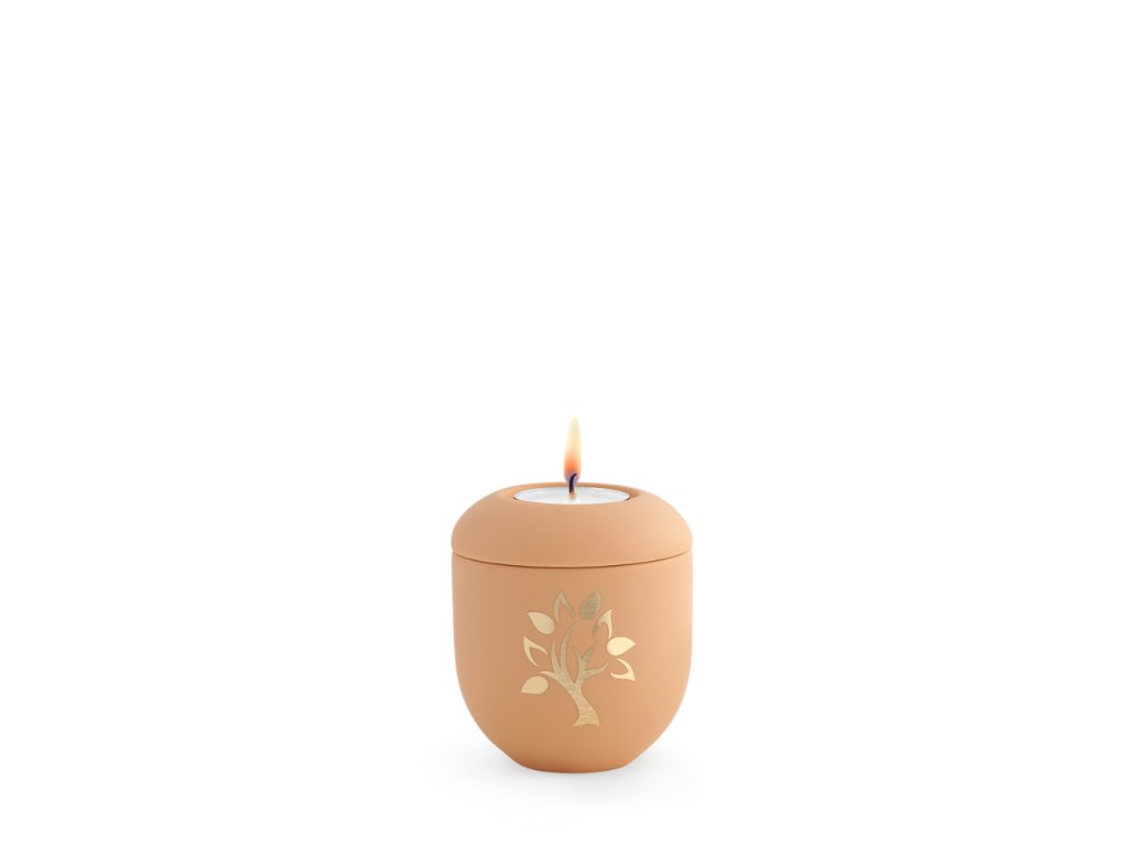 je vyrobená z vysoko kvalitnej keramiky. Miniurna v oraznžovej farbe je potiahnutá matným povrchom soft-touch, vďaka ktorému pôsobí jemne. Lesklý motív stromu má symbolický význam života, vzkriesenia a nesmrteľnosti. Miniurna má na viečku vlastnú čajovú sviečku.