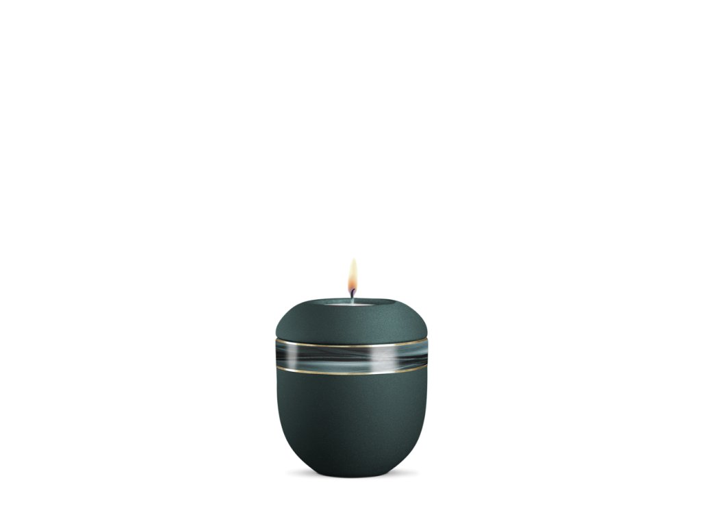 je vyrobený z vysoko kvalitnej keramiky. Má matný povrch v smaragdovom odtieni. Dizajn dopĺňajú vlny života v zelených odtieňoch a rámujú ho jemné brúsené zlaté pásiky. Miniurna má na viečku vlastnú čajovú sviečku.