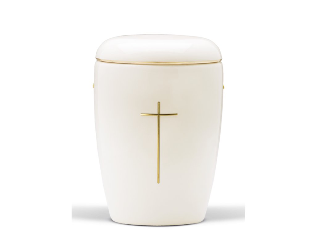 má lesklý glazovaný povrch v bielej farbe, zdobený zlatým motívom kríža a lemom okolo veka. Táto kombiancia je veľmi elegantná.