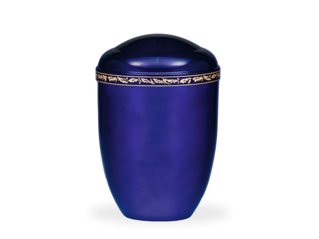 Kovová urna Klasik má matný povrch v odtieni kobaltovej modrej a je zdobená ozdobným zlatým pásikom s motívom listov.